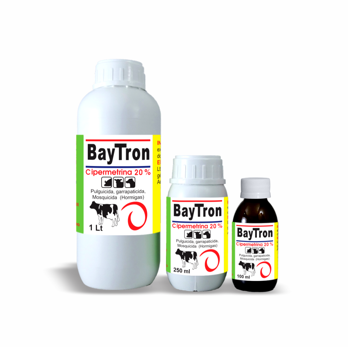 BAYTRON, es un antiparasitario de uso externo, en forma de emulsión, de amplio espectro, prolongado efecto residual y acción repelente, indicado para baños por aspersión, inmersión. Controla y elimina infestaciones de garrapatas, moscas, tábanos, piojos, ácaros de la sarna, ácaro rojo de las aves, pulgas y piques. Indicado para asegurar su programa de erradicación y control de plagas en centro de crianza, beneficio y explotación pecuaria.