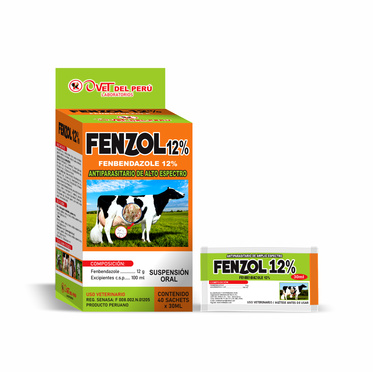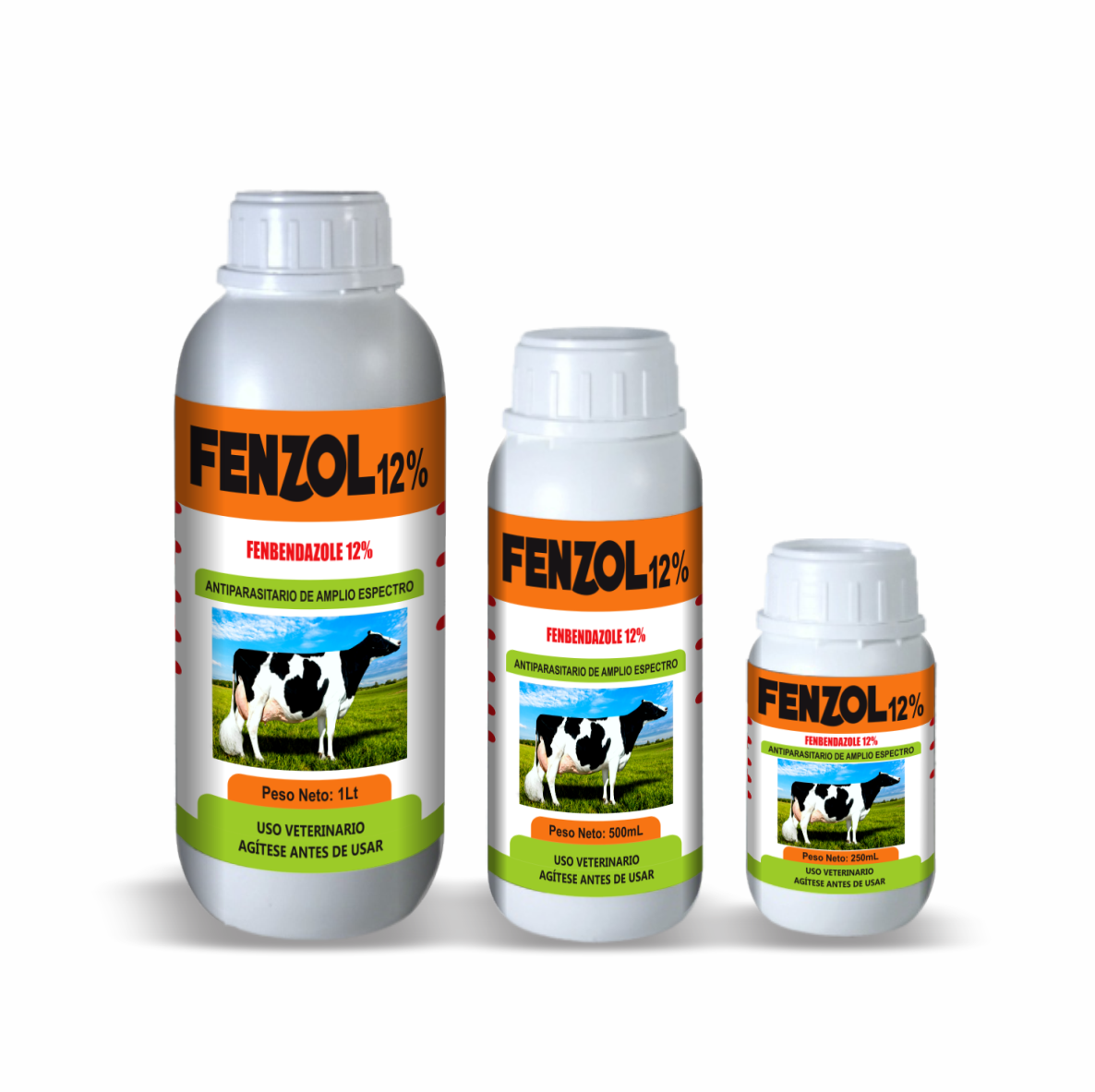 Fenzol 12%, es un antiparasitario interno en forma de suspensión oral indicado para el control y eliminación de nematodos gastrointestinales y pulmonares, incluyendo casos de teniasis en el ganado de pastoreo.