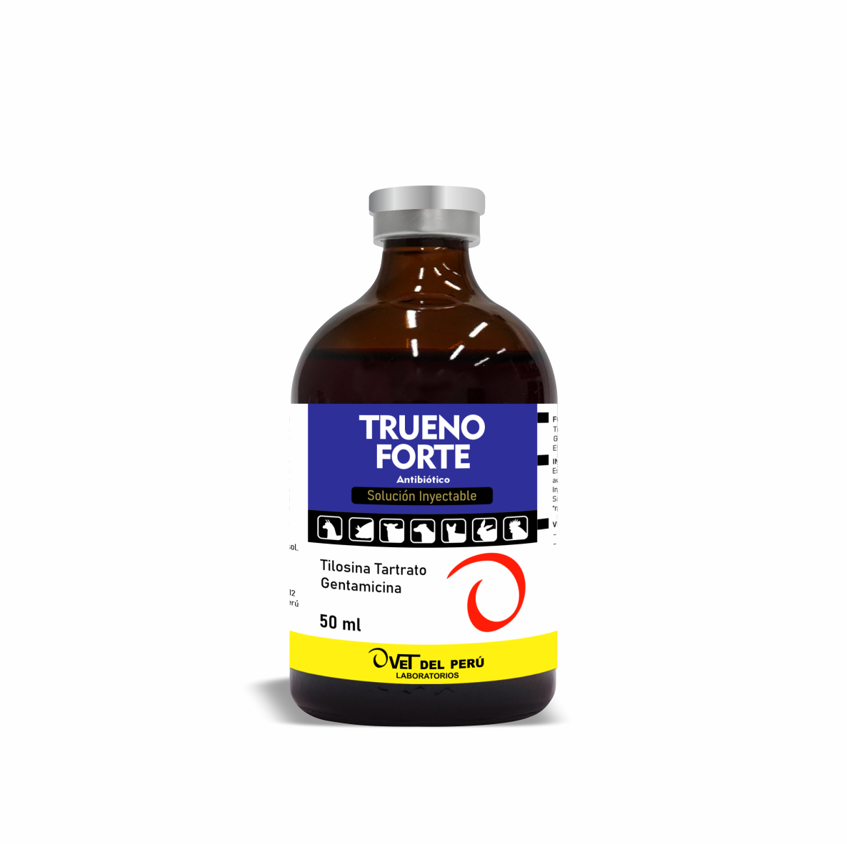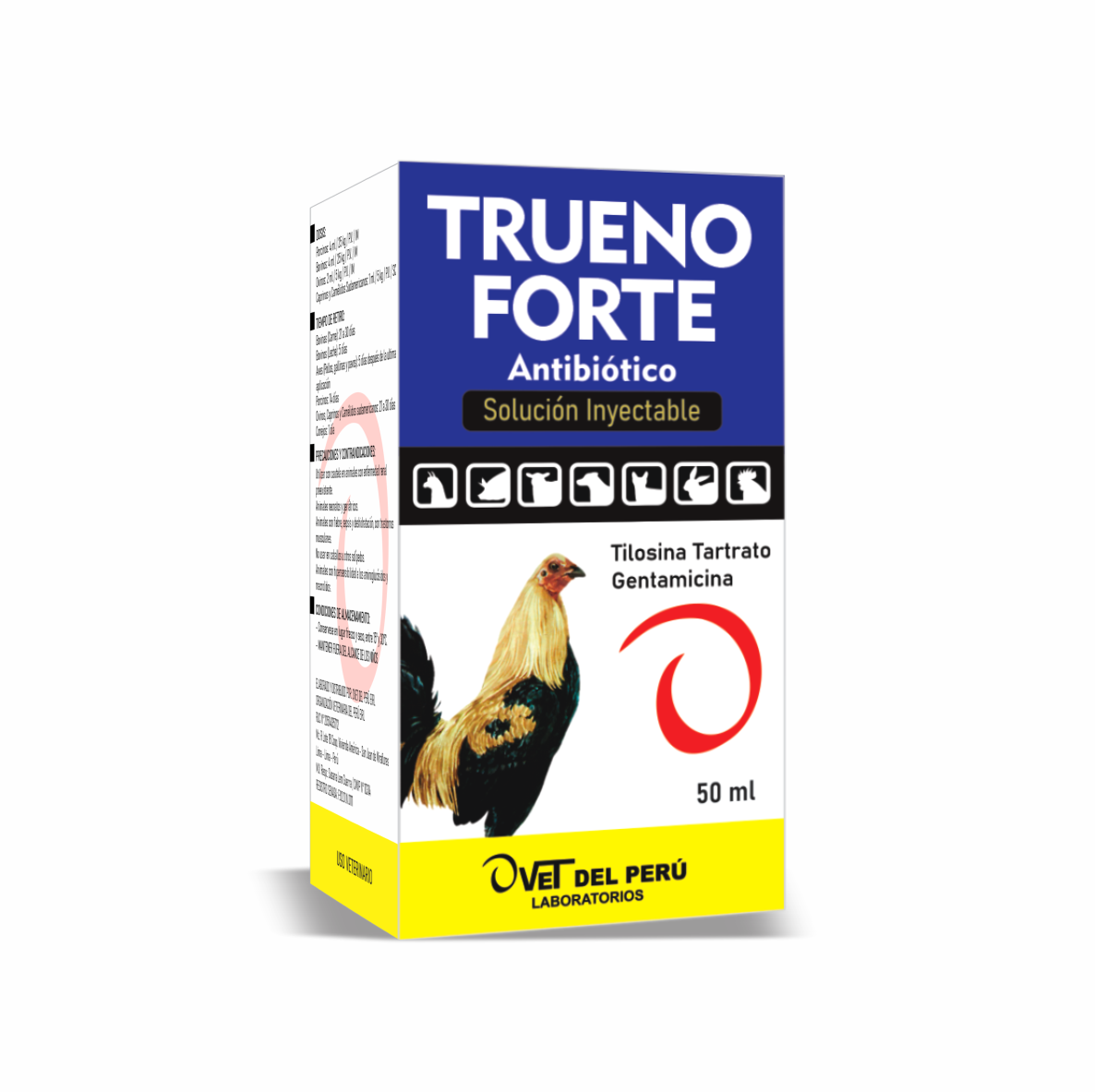 Trueno Forte, es un antibiótico de amplio espectro que incorpora en su fórmula dos antimicrobianos:La Tilosina, antibiótico macrólido de gran efectividad contra micoplasmas, procesos respiratorios agudos y crónicos y cojeras en aves, causante de amplio espectro de acción bactericida que actúa contra Escherichia Coli, Pseudomona, Aeroginosa, Proteus spp, Staphylococcus spp, Clostridium spp.